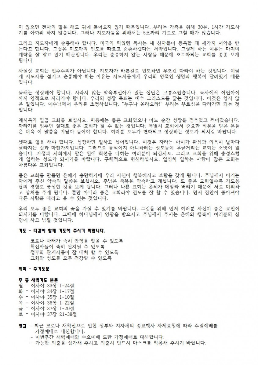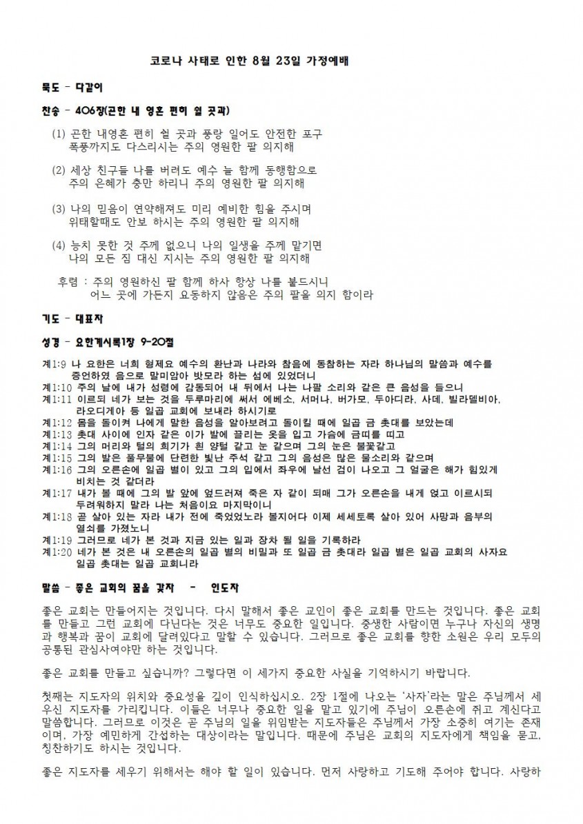 8월 23일 교회소식 작성자 섬김이 작성일20-08-23 12:42 조회236회 댓글0건 관련링크 목록 답변 본문 코로나 재 확산에 따른 예방을 위해 오늘 예배는 가정예배로 대신합니다. 댓글목록 등록된 댓글이 없습니다. 목록 답변